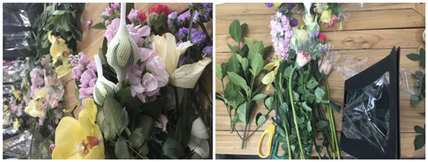 活动开始之前,鲜花和篮子有序地放在桌子上。