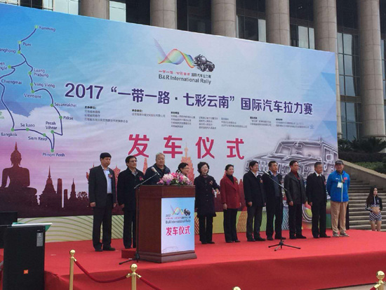 发车仪式由云南省体育局副局长常林主持,云南省体育局局长尹勇率先致辞,他指出:“一带一路•七彩云南”国际汽车拉力赛是云南省的一项重要体育赛事,也是云南省体育局一直在打造的品牌赛事。2017年“一带一路•七彩云南”国际汽车拉力赛的举办,是贯彻落实“一带一路”倡议的重要举措,有利于促进云南与南亚东南亚国家和地区的多层次、多领域的商贸、体育和文化交流,打造民间外交新机制,提升云南作为国家面向南亚东南亚辐射中心的形象。尹勇局长也祝愿参赛选手能够克服行程中的各种困难,安全、圆满地完成拉力赛的各项任务。云南省人大原副主任、云南省东南亚南亚经贸合作发展联合会原主席王义明随后发言,她表示希望本届拉力赛可以帮助云南省企业广结商机,取得更多的合作成果,推动云南的经济建设。接下来参赛车手代表进行了发言。最后,云南省人大常委会副主任刀林荫向车队副领队授予拉力赛队旗,并宣布2017年 “一带一路•七彩云南”国际汽车拉力赛正式启程。